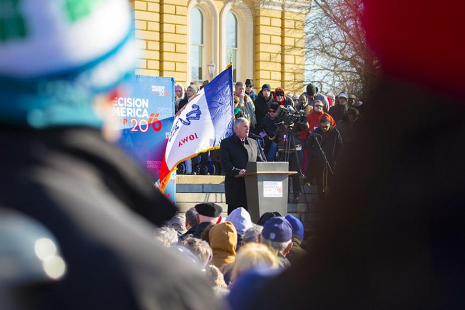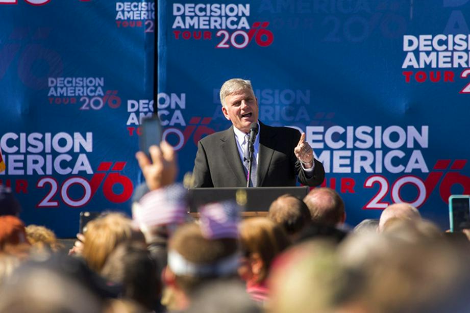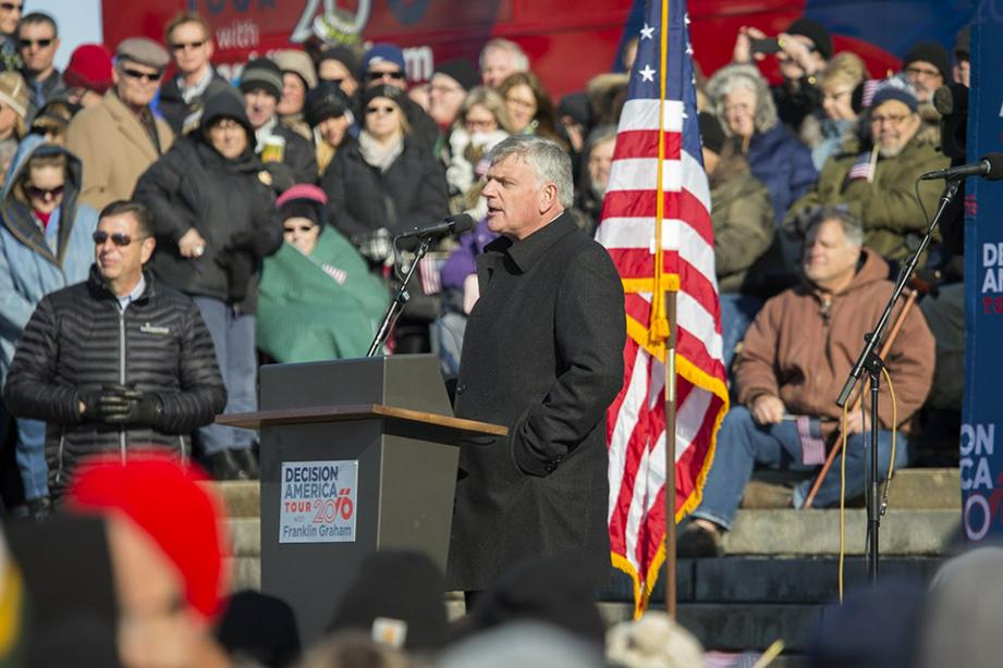 2016年新年才过去2周,美国著名布道家葛福临的脚步已经巡回了爱荷华和佛罗里达两个州,带领那里的百姓一同祷告,开启今年的“美国决志之旅”(Decision America Tour)。 “我将要去我们国家每一个州,去挑战基督徒们在家中、公共空间中和大选投票箱中活出信仰——同时我也会分享福音。”葛福临如何介绍“美国决志之旅”。 这是一位爱上帝、爱自己国家和民族的人做出的行动。此次的背景是美国即将迎来新的一届总统大选,而美国又面临着许多内部的撕裂和挑战,比如同性婚姻、堕胎、全民医保等问题,激进和保守的价值观有激烈的征战。到底这个民族和国家要走向何方?葛福临在此次活动中79秒的宣传视频中表达了自己的期盼和决心,他希望美国重新回到民族的根基“In God We Trust”的核心价值观中,他认为即将到来的大选可能是“最重要的一次大选”,因此他愿意走上这样的征程,到各个州邀请基督徒们一同为国家和民族的未来祷告。| 50个州的祷告场地基本都安排在当地议会附近的广场。