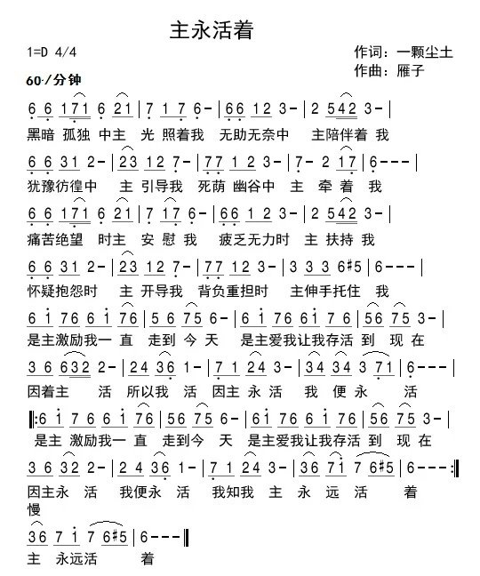 如今离医生的结论已经过去了5年,不可思议的是,癌症一度还缩小了,可谓奇迹。和他一起看病的大部分都走了,他还在,而且还继续在教会服侍,教歌。神聆听了大家的祷告,是神用大手托住了他的宝贝孩子。今年3月再次复查,得知癌症转移到肺部,要做放疗了。知道这个消息,我又是泪流满面。我对他说“尘土,你写一首歌词吧,我来谱曲。”他说好。这就是大家现在听到的《主永活着》,唱哭了很多人,我和尘土都是流泪创作。