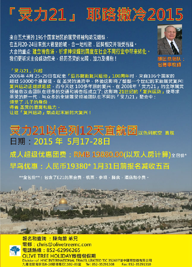 2015年5月17-28日,将于圣城耶路撒冷举办“灵力21”特会,Empowered 21是全球灵恩大会,每年都会在世界各地举办。去年在香港,今年定于耶路撒冷,此次除了参加特会之外,大会还将带领大家走访耶路撒冷各大名胜古迹。