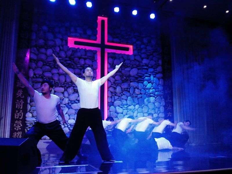 教堂的背景墙设计得既庄严又艺术,鹅暖石铺底的墙上,顶天立地一个红色的十字架,舞台的两旁是两张大大的投影幕布,将舞台上的影像放大,音响灯光一开,十分震撼。连讲台都是专门请美术学院的艺术家设计的。每周四举办大型祷告会,人山人海,祷告会结束,教会专门租用几十辆公交车送大家回家,因为太晚公交已经停了。为此教会每年要花费十几万。而深夜从教堂开出的车队,又成为宝鸡的一大风景线,福音就这样晃晃荡荡进入城里。哈利路亚。