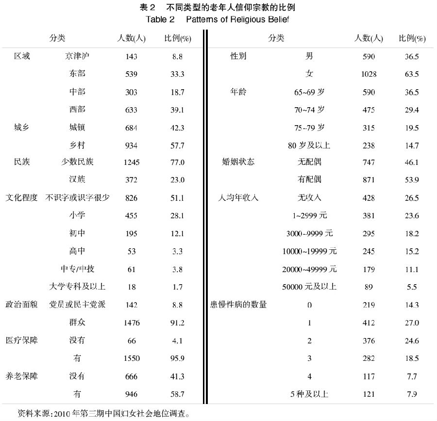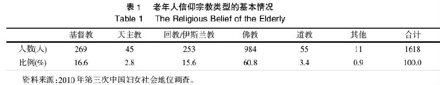 以2010年12月1日为时点的第三期中国妇女社会地位调查,是全国妇联和国家统计局继1990年、2000年第一、第二期中国妇女社会地位调查后组织的又一次全国规模的国情、妇情调查。个人调查主问卷的对象是:调查时点上全国除港、澳、台以外居住在家庭户内的18至64周岁的男女两性中国公民。在中国人口老龄化迅速发展的背景下,为了深入分析老年妇女社会地位状况与变化,本次调查还对调查户内65周岁及以上老年人进行了调查研究。调查采用抽样调查方法进行数据收集。为能够同时进行全国分析和省级分析,采用按地区发展水平分层的三阶段不等概率(PPS)抽样方法选取样本。本次调查共回收65岁及以上老年群体有效问卷10793份,包含老年人宗教信仰相关信息的有效问卷有10547份。以下分析是基于对10547位65岁及以上老年人口的分析。