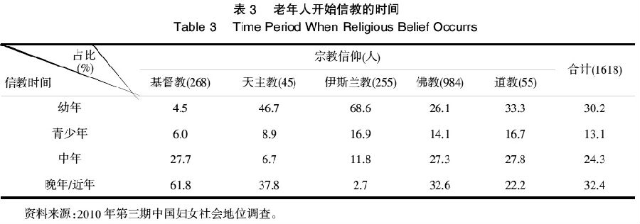 在西方国家中,许多人从小受宗教文化的影响,幼年便开始信仰宗教;而我国的社会文化不同,长期宣传无神论,那么老年人从什么时候开始信仰宗教?对老年人开始信仰宗教时间的调查结果表明:32.4%的老年人是老年阶段或近年开始信仰宗教,即老年期信教;30.2%的老年人信教时间是幼年时期;24.3%的老年人信教时间是中年时期;13.1%的老年人信教时间是青少年时期(见表3)。