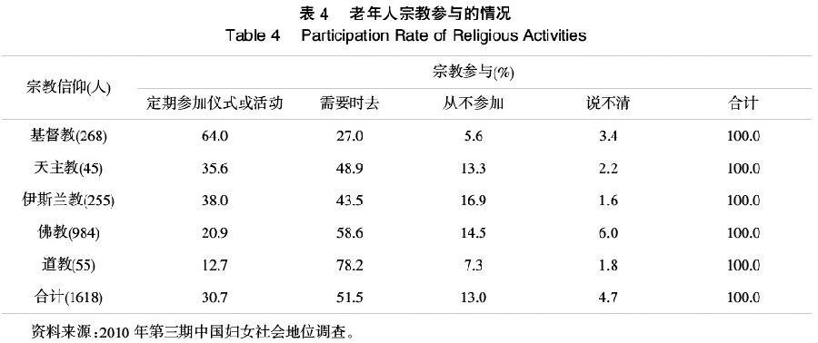 在表4中,比较特殊的是信仰伊斯兰教的老年人中定期参加宗教仪式或活动的比例仅为38.0%,从不参加宗教仪式或活动的比例为16.9%。具体原因需要在今后的调查中进一步了解。结合以往的相关研究文章,可能的原因包括老年伊斯兰教教徒健康状况较差,例如新疆近期的一项老年人信仰宗教研究中,由于身体健康原因,85%以上的老人都会选择在家进行一些宗教仪式而不是去清真寺(古丽娜尔·阿扎提,2014)。在2010年的妇女地位调查中,从不参加宗教仪式或活动的老年人中,健康状况差的老年人比例为41.9%,分别比定期和需要时去参加宗教仪式或活动的老年人高12.8个百分点和6.9个百分点。从不参加宗教仪式或活动的老年人以城市老年人为主,从不参加活动的城市老年穆斯林比例为55.8%,分别比定期和需要时去参加宗教活动的老年人高29个百分点和23.4个百分点。由于在调查时没有明确对公共宗教活动参与和私人宗教活动进行区分,因此可能导致被调查者在回答时未考虑私人宗教活动。