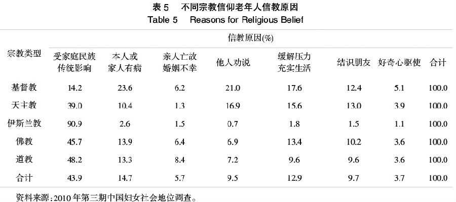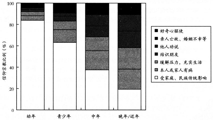 从开展本项调查时不同年龄老年人的情况看,信仰宗教时年龄越大的老年人,家庭或民族传统因素对老年人信仰宗教的影响越小,而患病、亲人亡故、婚姻不幸、他人劝说、结识朋友、缓解压力充实生活等因素对老年人信仰宗教的影响越大。因此,中年和老年成为老年人信仰宗教的高峰时期,主要是因为中晚年生命历程转变时期老年人面临的疾病、家庭、婚姻、人际关系等方面压力的挑战。