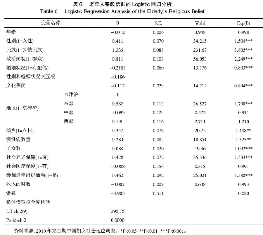 当控制其他变量后,年龄、收入和社会医疗保障3个变量对老年人是否有宗教信仰无显著影响,其他变量对老年人宗教信仰影响显著。