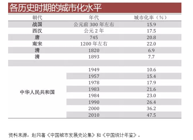 古老的中国也是世界城市发源地之一。公元前1700年时,商代就已开启了中国连续而持久的城市文明模式。随后,汉朝的长安、唐朝的洛阳、宋朝的开封都是各自那个时代世界上最繁华的令人羡慕的十大城市之一。资料显示,从汉代到清代,县级以上的城市基本保持在1300个左右,可以说,古代中国城市与欧洲相比不仅数量多,规模之大也是世界所罕见的;并且中国古代的城市化水平也远远居于世界前列。据《中国城市发展史论集》和《中国统计年鉴》数据,早在战国时代(公元前300多年),中国的城市化率就已达到了15.9%,唐朝天宝年间(745年),城市总人口达到1100万人,全国总人口约为5300万,城市化率达到20.8%。宋朝的城市化率,则达到了22%的水平。而在1800年,世界城市化水平也仅3%
