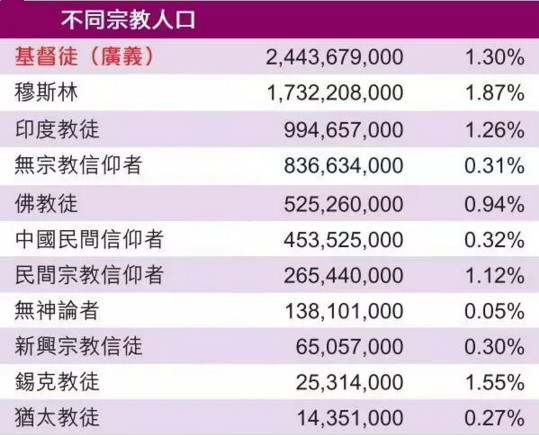 在宗教人口方面,除基督徒、穆斯林之外,印度教徒与佛教徒、民间宗教信仰者增长速度也都值得关注,分别是1.26%,0.94%与1.12%,另外中国民间宗教信仰者现在为4.5亿多,增幅为0.32%。
