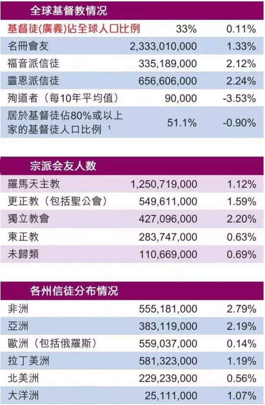 在全球基督教情况情况中,基督徒占全球人口比例为33%,比去年上升0.11%,基本持平,其中名册会友为2.3亿(增幅1.33%),福音派会友3.3亿(增幅2.12%),灵恩派信徒为6.5亿(增幅2.24%)。