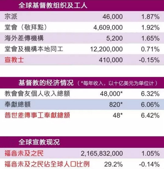 在福音未及之民方面,目前为21亿6千万,比去年增长1.05%,在全球人口比例中占29.2%。