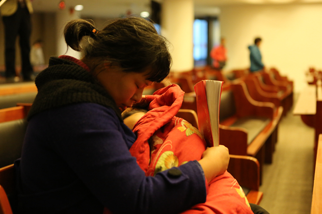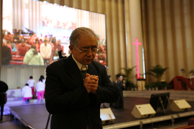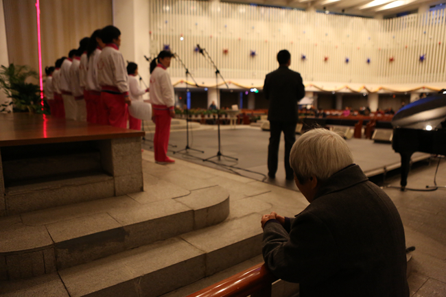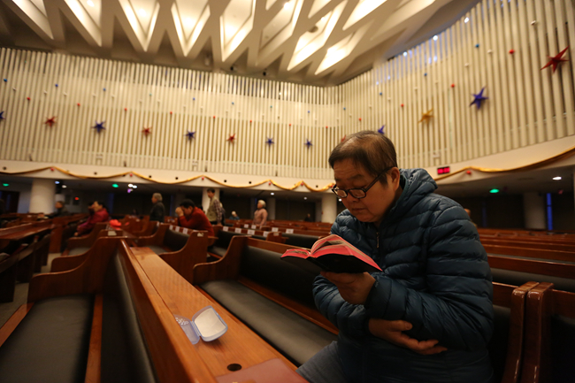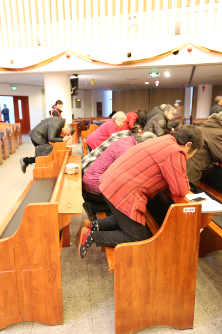 3月27日,即2016年复活节当天清晨6点,北京海淀堂主堂举办了一场晨曦祷告会。祷告会开始时,教堂里人数还不多,但不觉得冷清,摄像、灯光、摄影等义工都在忙碌着。十字架前跪着一排信徒,正在用祈祷与主沟通。
