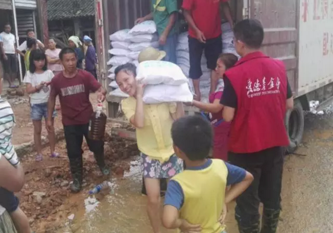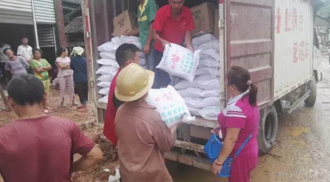 7月9日,爱德救援队于九潮镇罗伍村向80-90户约330位村民发放近5吨大米,以应对灾后生活。