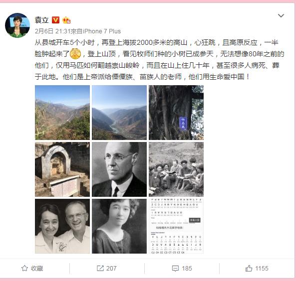 袁立感慨说:“从县城开车5个小时,再登上海拔2000多米的高山,心狂跳,且高原反应,一半脸肿起来了,登上山顶,看见牧师们种的小树已成参天,无法想像80年之前的他们,仅用马匹如何翻越崇山峻岭,而且在山上住几十年,甚至很多人病死、葬于此地。他们是上帝派给傈僳族、苗族人的老师,他们用生命爱中国!”