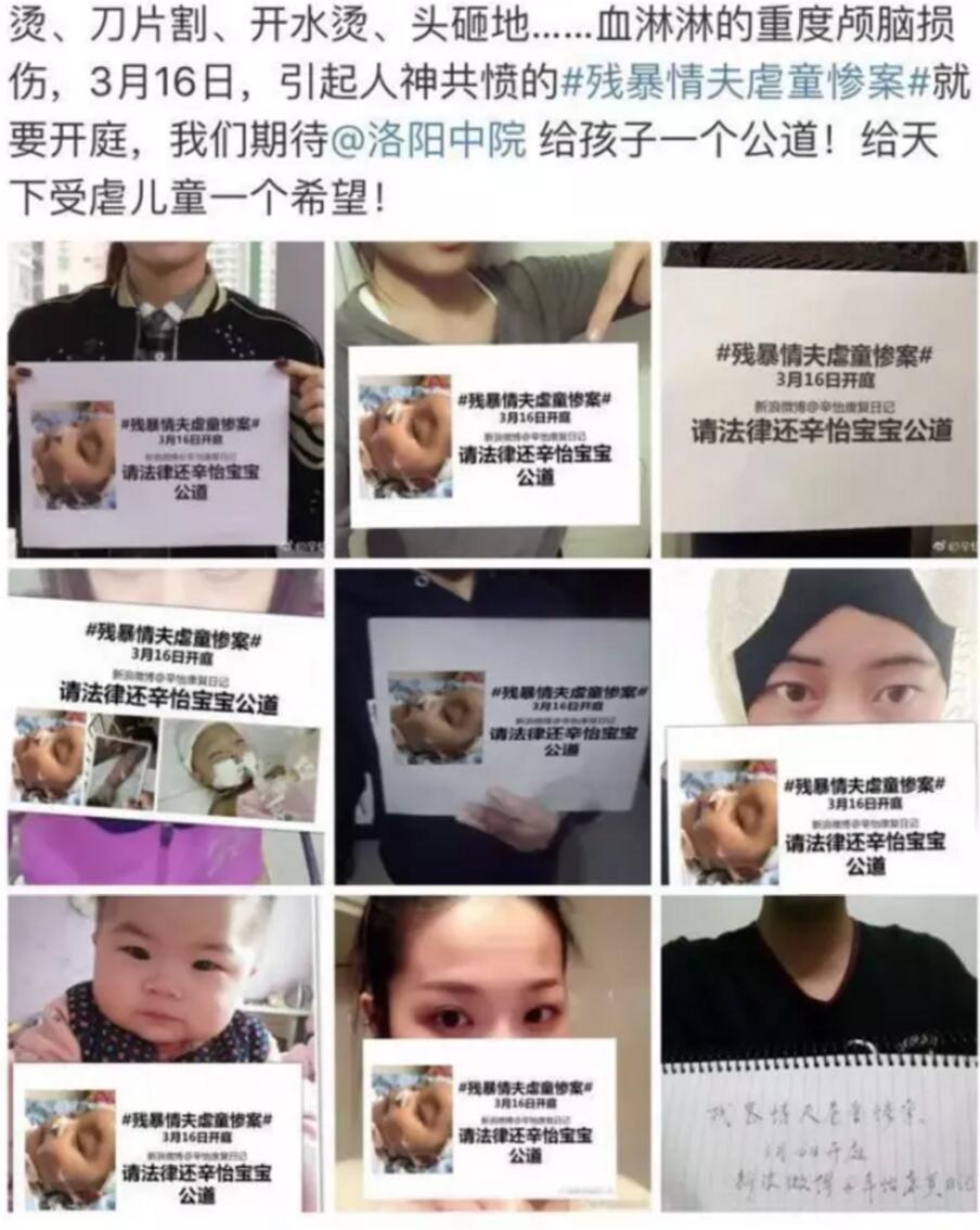 3月16日,涉及此案的两个犯罪嫌疑人辛怡母亲刘姣利和其情夫赵跃飞的开庭审理之日,辛怡微博“辛怡康复日记”以及多数微博网友纷纷晒照以及转发,共同声讨两个犯罪嫌疑人,为落泪的天使守护正义。
