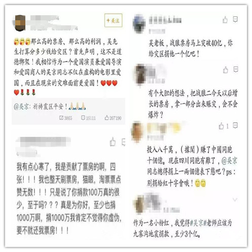 于是,开始有了一系列的键盘侠纷纷“英雄出手”,开始“指导”吴京要捐个一两亿聊表态度:“你赚了这么多,好几十亿,捐个一两亿那都不叫事,对不对?”