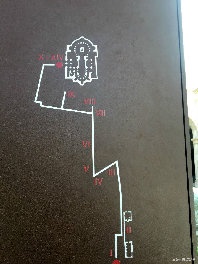 苦路的开头就在耶路撒冷老城这耶路撒冷老城东北部、狮门内的一所中学里,沿着弯弯曲曲、狭窄的老城街巷。这里有Via Dolorosa的标志、苦路十四站的地图与说明。