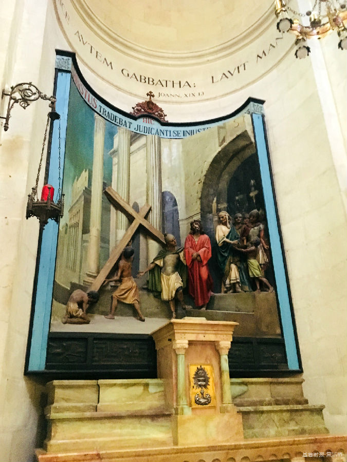 走进“定罪教堂”(Chapel of Condemnation)里面,最令人印象深刻的就是许多个耶稣背上十字架的雕像。耶稣被鞭打后,被罗马兵丁戏弄,戴上荆棘冠冕兵,先是给他脱下已经鲜血浸染的血衣,又穿上红色袍子,接着残忍的脱下给他换上血衣。之所以说残忍,是因为每穿、脱一次衣服,鲜血直流的耶稣都在忍受着剥皮般的痛苦。随后,他们让耶稣背上十字架。