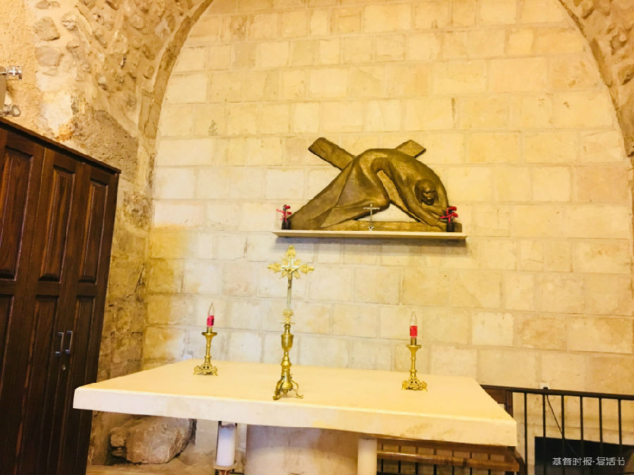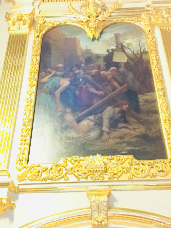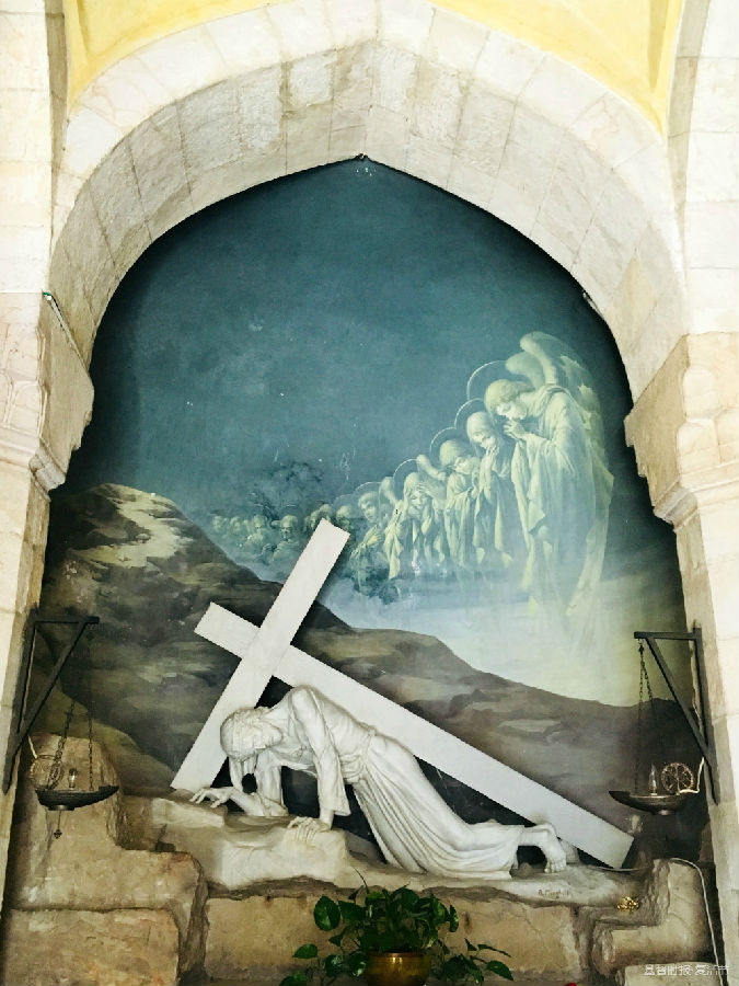 已经忍受了连续数个小时审问、羞辱、鞭打的的耶稣,背上比他整个人都大很多的重重的十字架,一路走得很缓慢。周围是无数看热闹的犹太人跟着围观,罗马兵丁毫无怜悯知心,继续用鞭子抽着耶稣催促他快点走,结果耶稣第一次摔倒在地上。如今这里之上已经建成一个天主教教堂,摆放着耶稣摔倒的雕像供人纪念。