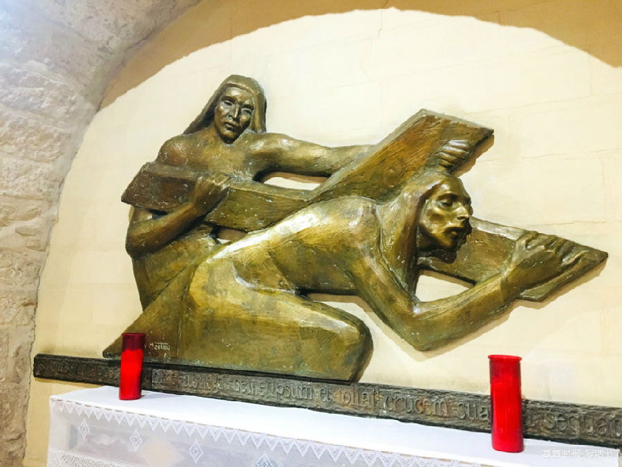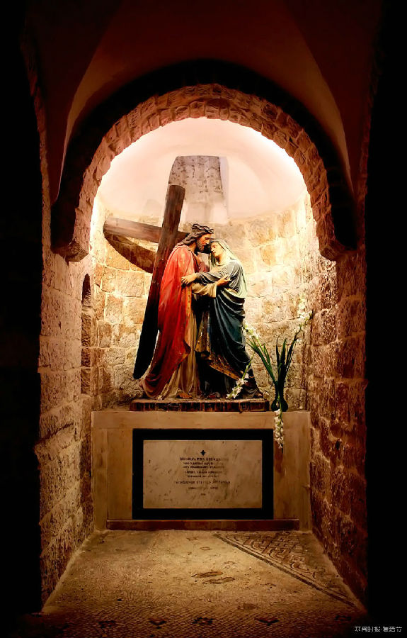 两千多年前,耶稣因为他对上帝的信心和对人类的大爱,背着沉重的十字架,在罗马兵丁的鞭打下从这里经过,最终走向加略山,成就了上帝对人类的伟大救恩。“苦路”中途有14 次停顿,所以人们把这14 次停顿称为十四站,其中在三处耶稣被十字架压倒。