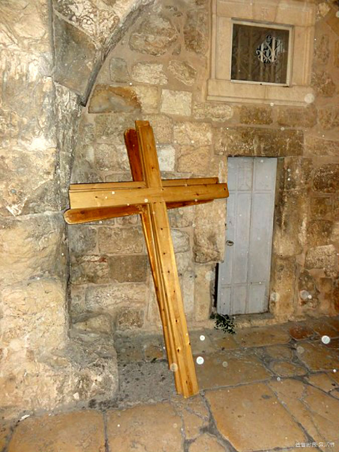 圣墓大殿的一幅画展现了耶稣被钉在十字架上的场景。被脱了衣服的耶稣平躺在十字架上,兵士们用大铁钉穿透耶稣的双手和双脚,这是一种肉体被撕裂的极大的痛苦。