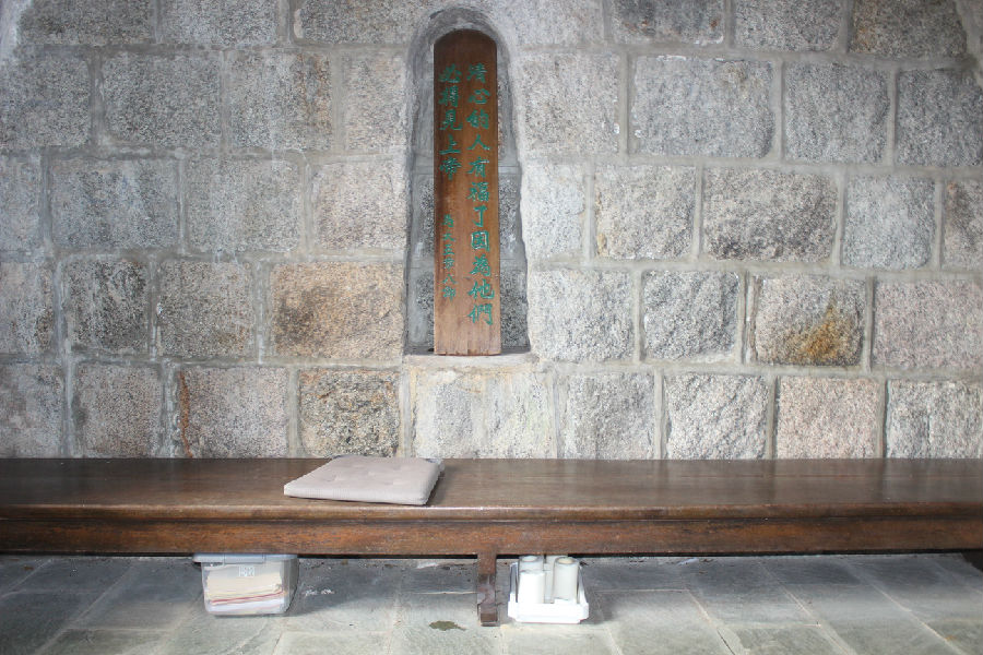 嵌入两边石壁则有两处刻有经文的木板,分别写着:“清心的人有福了 因为他们必得见上帝 马太五章八节”和“耶稣基督的宝血能洗净我们一切的罪 约壹一章七节”。两旁放有长椅,游客可在此安静默想祷告。