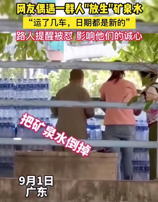 近日,有媒体报道称,广东一条小河边,一群人拉来几车矿泉水,拧开盖子就往河里倒。有热心市民过去查看,发现矿泉水都是最新的日期,于是便进行劝告,却引来倒水之人的怒怼,认为市民的建议会影响他们的放生诚意和功德。相关视频画面显示,当时有三五个人共同参与这次特殊的“放生”,拍摄者称由于矿泉水数量比较多,这次“放生”从早上10点多一直持续到中午12点,接近两个小时的时间。