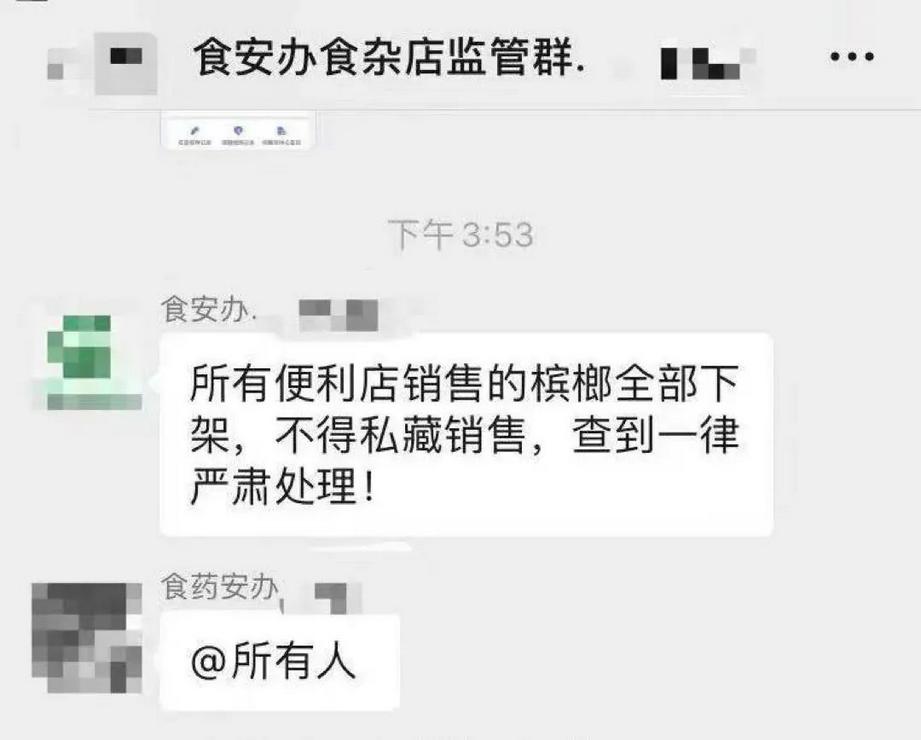 “市监局的人9月15号下午在微信群里通知: 所有便利店销售的槟榔全部下架,不得销售。 ”徐先生说,他当日刚从槟榔经销商处进了一批货,下午便收到了下架槟榔的通知,暂时不知如何处理店内的槟榔存货。