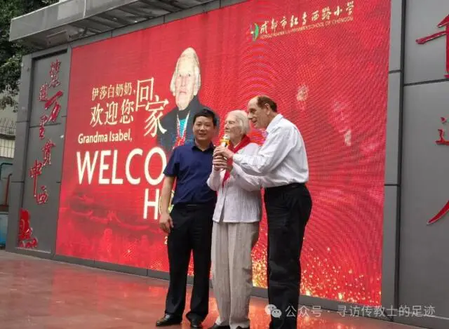 2019年6月25日,104岁的伊莎白在三个儿子的陪同下从北京来到成都,回到了魂牵梦萦的华西坝。伊莎白想在她的有生之年看看她的出生地、儿时居住的老房子、上过学的学校,以及健在的故人,26日上午参观其母亲饶珍芳当年出任校长的弟维小学,校门外显示屏上的欢迎标语分外醒目:“伊莎白奶奶,欢迎您回家。”